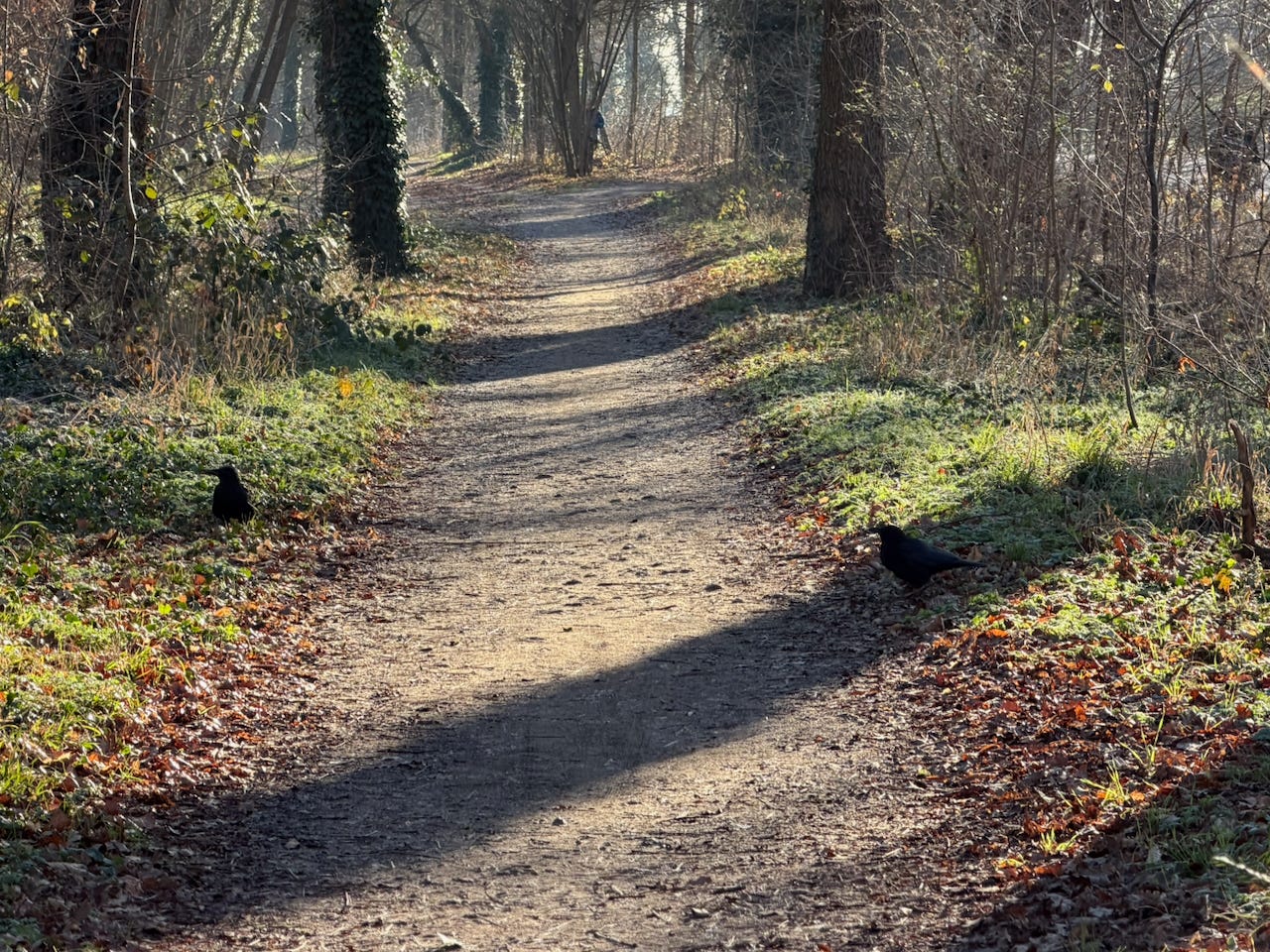 On one January morning, four miles into an 8.5 mile loop through Bois de Vincennes, two large ravens appeared in the path ahead of me. They stood perhaps twenty feet away, watching me approach.